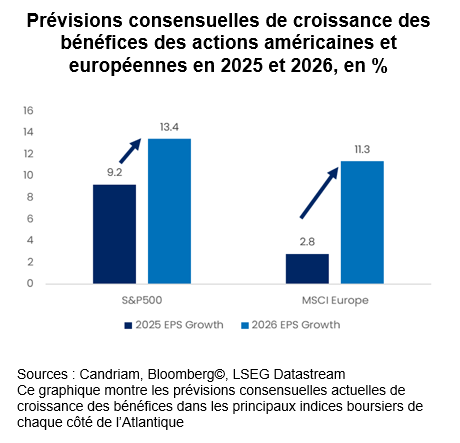En plus de l’atténuation du bruit dans les publications économiques (soit par une amélioration des données d’enquête, soit par un affaiblissement des données d’activité), nous suivrons de près l’évolution des anticipations de croissance des bénéfices dans les semaines à venir. Pour le moment, les prévisions consensuelles de croissance des bénéfices des entreprises apparaissent trop optimistes au regard de nos perspectives de croissance. À quel niveau la croissance des bénéfices s’établira-t-elle en 2025 ? La croissance va-t-elle s'accélérer en 2026 par rapport à 2025 ?