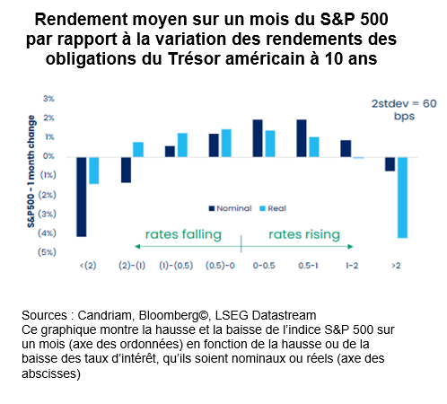 Nous allons également extraire des signaux du marché obligataire pour gérer le budget de risque. La volatilité obligataire a augmenté depuis le début de l’année, et une vitesse de variation disproportionnée constitue un facteur important pour la performance des marchés actions : une variation de 2 écarts-types en l’espace d’un mois (ce qui correspond à 60 points de base sur le rendement des bons du Trésor américain à 10 ans) représenterait un risque pour les marchés actions. En résumé : la stabilité des marchés actions dépend de taux d’intérêt bien ancrés.