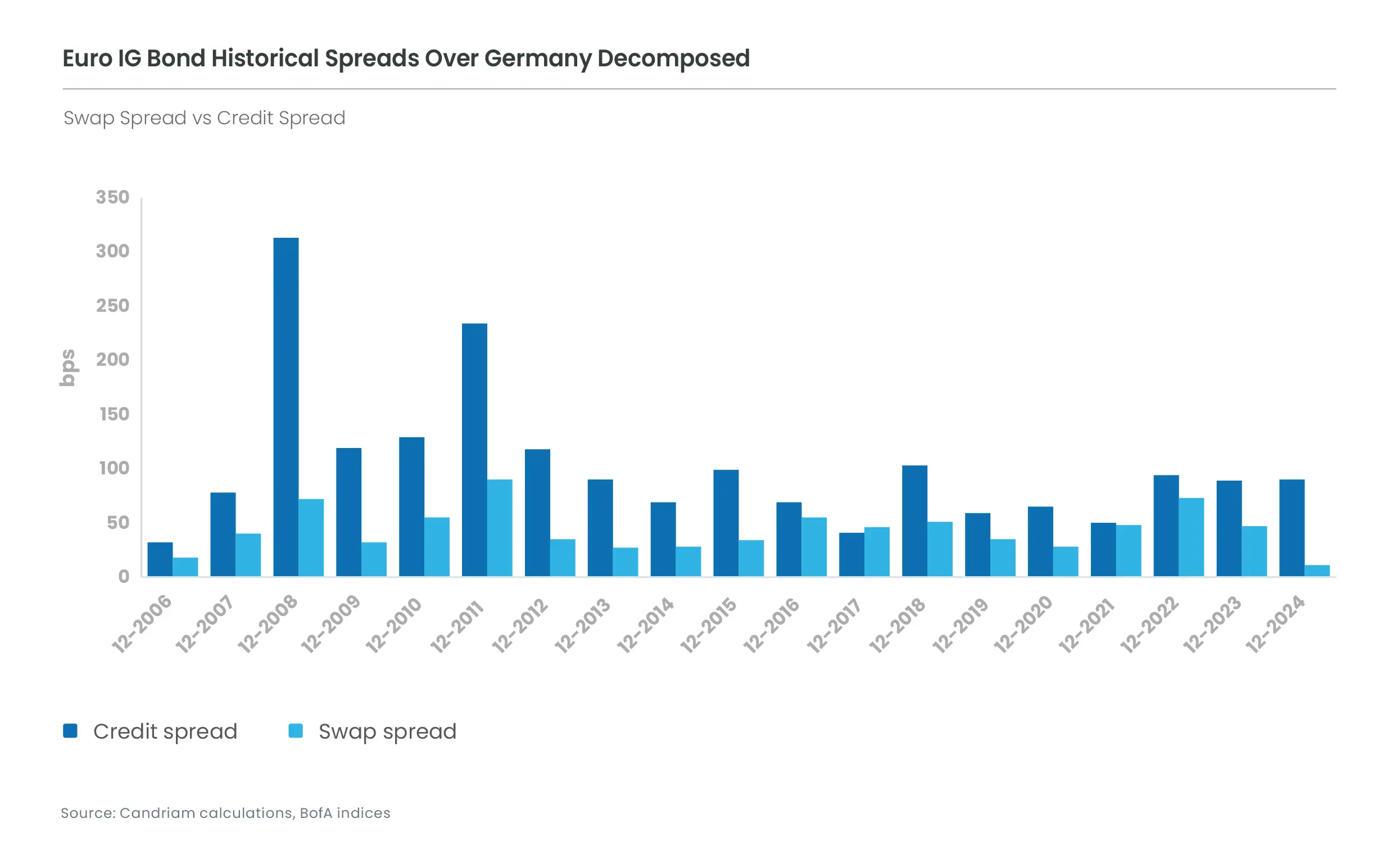 Si l'on considère un spread par rapport aux émissions gouvernementales allemandes (Bunds), nous essayons de distinguer l'élément attribuable au véritable écart de crédit réelle de celui lié au swap spread. Dans notre univers, cela nous aide à évaluer les obligations d'entreprises par rapport aux obligations quasi-gouvernementales (supras) ou souveraines.
