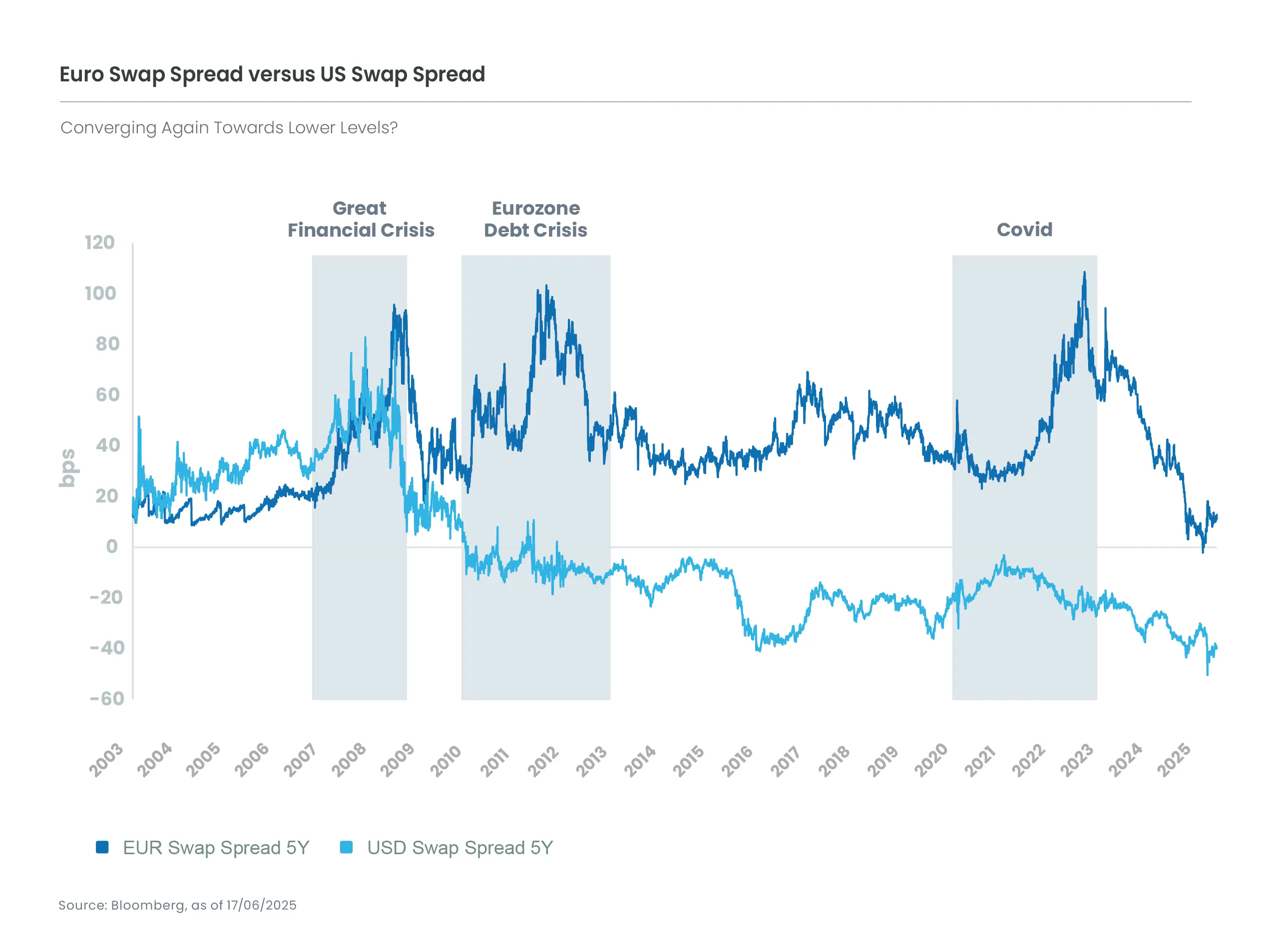 Peut-être avons-nous été un peu trop désinvoltes ; nous surveillons bien sûr les swap spreads à un niveau global. Il y a des raisons de penser que nous pourrions entrer dans un nouveau régime, avec un retour des swap spreads en euros à leurs niveaux d'avant la grande crise financière. L'offre d'obligations d'État en euros, valeurs refuges, augmente en raison de la politique budgétaire plus expansive de l'Allemagne, tandis que la demande diminue avec l'arrêt progressif du programme d'assouplissement quantitatif de la BCE. Mais nos efforts ne sont pas perdus pour autant. Les années passées à gérer ces crises et à analyser les facteurs à l'origine des swap spreads devraient encore permettre aux gestionnaires de portefeuille d'exploiter une partie de leur volatilité pour évaluer les différents segments obligataires européens.