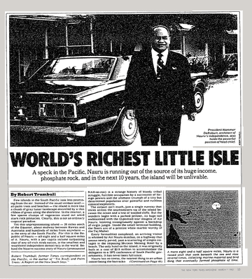 Dans les années 1970, la toute petite île de Nauru pouvait s’enorgueillir d’afficher le revenu par habitant le plus élevé au monde, après celui de  l’Arabie Saoudite. Cette richesse provenait de l’exploitation intensive de mines de phosphate, une matière issue de l'accumulation sur des centaines d’années de fientes d'oiseaux marins, et qui était utilisée comme engrais.