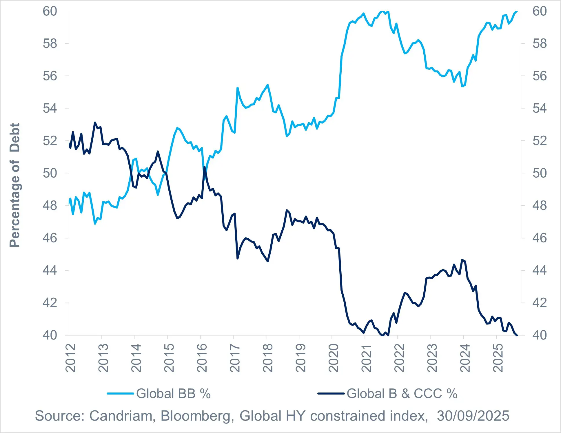 La tendance des notations demeure positive, tandis que les taux de défaut restent parfaitement maîtrisables. Au sein de l’univers du haut rendement, environ 60 % des émetteurs sont désormais notés BB [1], reflétant une nette amélioration de la qualité moyenne.
