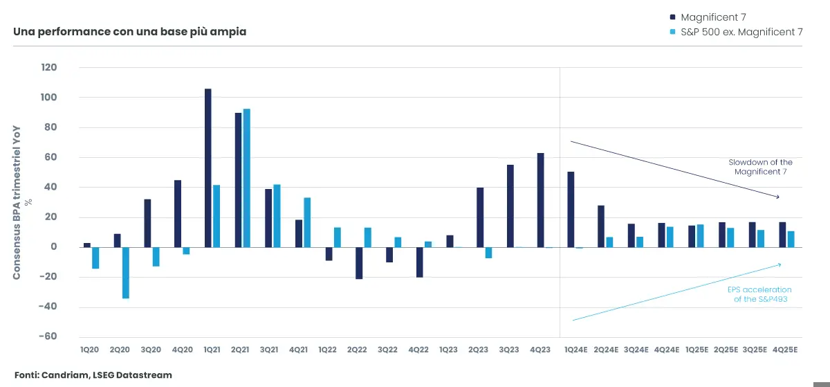 Nel mercato statunitense, rimaniamo positivi sul settore tecnologico, che dovrebbe continuare a godere di una forte crescita degli utili e del flusso di cassa. Dopo 4 trimestri di dominio da parte dei magnifici 7 (aumento di oltre il 40 % degli utili, in gran parte guidato da Nvidia[8]), si prevede che le altre 493 società S&P500 registreranno una crescita positiva degli utili e chiuderanno il divario con le Megacaps. In questa ipotesi, il rialzo dei mercati finanziari sarebbe più salutare, poiché sarebbe trainato dall’andamento positivo di un maggior numero di titoli.