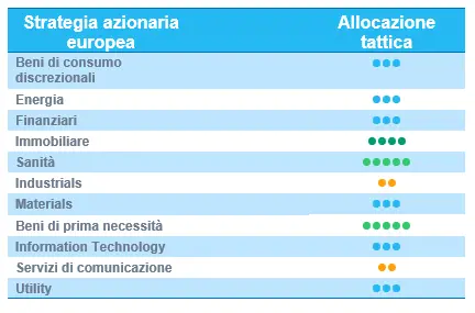 Abbiamo confermato il nostro rating positivo (+2) sul settore sanitario. Tale settore offre in Europa un interessante profilo di rischio/rendimento grazie a valutazioni ragionevoli, una forte visibilità sui flussi di cassa e una prevista crescita degli utili.