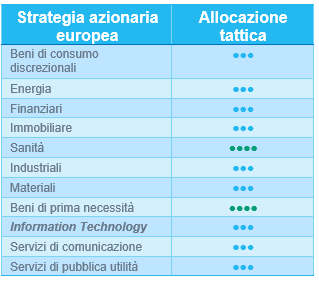 Dall'ultimo comitato, i multipli di valutazione europei sono leggermente aumentati con un P/E forward a 12 mesi di 14,4x, ancora di molto inferiore ai multipli statunitensi (22,0x). I settori più costosi sono information technology e industriali (P/E rispettivamente di 27,9x e 19,5x), mentre energia e finanziari sono i più economici (P/E rispettivamente di 8,3x e 10,0x).