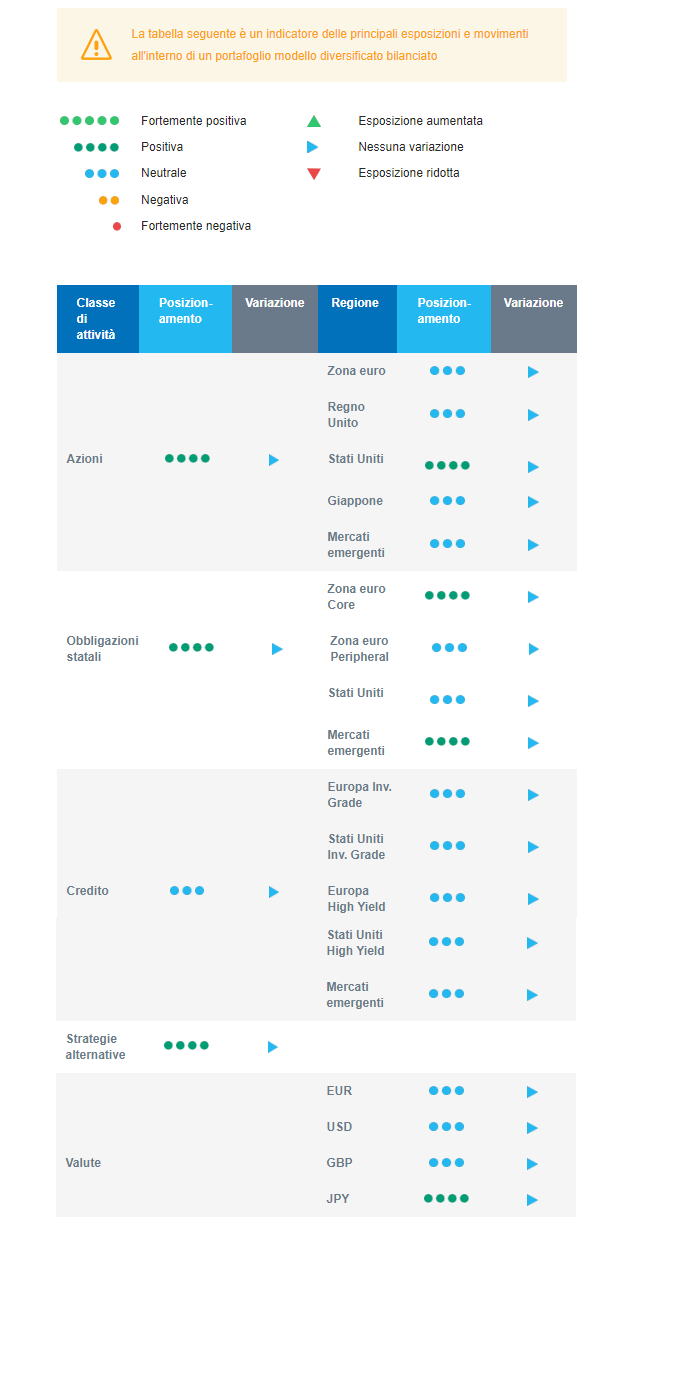 - La recente correzione del mercato del 5-7% (rispetto al suo picco) ci ha offerto l'opportunità di aggiungere azioni globali attraverso i mercati sviluppati e la nostra prospettiva sull'azionario resta positiva.