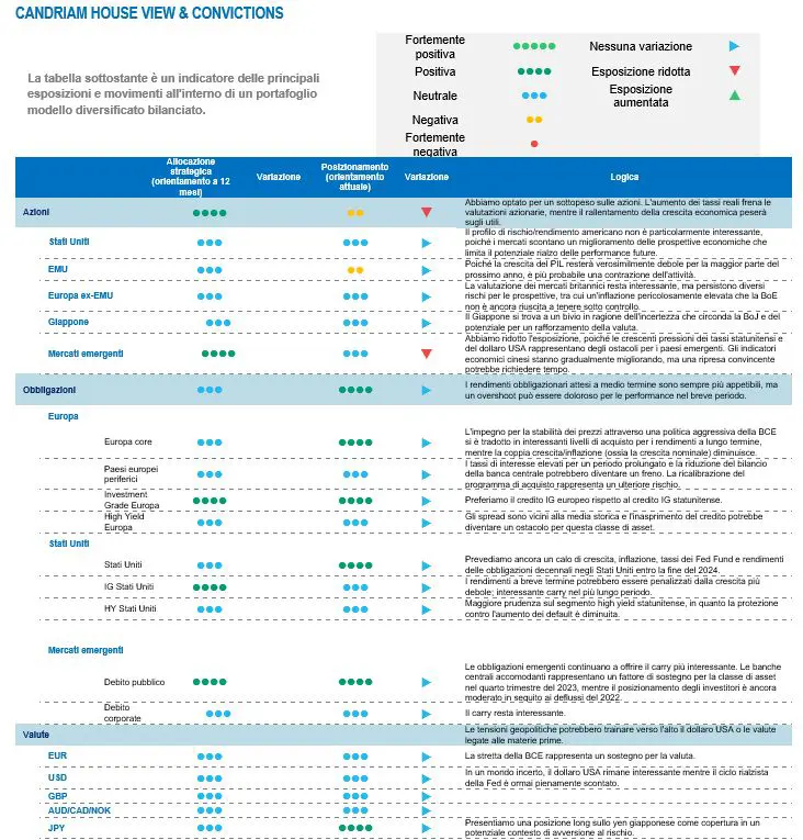 Abbiamo optato per un'asset allocation più cauta, poiché hanno iniziato a materializzarsi molteplici rischi. Le banche centrali su entrambe le sponde dell'Atlantico mantengono una politica monetaria restrittiva, con una debole crescita economica nel 2024 che appare come lo scenario più probabile. Inoltre, la forte ascesa dei rendimenti obbligazionari nei mesi estivi, con quello del decennale statunitense salito di 73 pb nel terzo trimestre, ha ulteriormente inasprito le condizioni finanziarie, intensificando le pressioni sull'economia e gli asset rischiosi. Nel complesso, l'incremento dei tassi reali frena le valutazioni azionarie, mentre il rallentamento della crescita economica peserà sugli utili, inducendoci ad assumere un sottopeso sulle azioni. I rischi per le prospettive di crescita globale tendono sempre al ribasso sulla scia degli sviluppi geopolitici: diversi sono i fronti di guerra aperti, che si traducono in un aumento di incertezze e vulnerabilità.