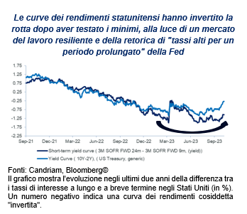 La reazione dei mercati all'ascesa dei rendimenti obbligazionari a lungo termine denota un cambiamento rispetto alle tendenze recenti: le curve dei rendimenti non si invertono più ulteriormente poiché gli investitori rivalutano al rialzo il premio per detenere rendimenti a lungo termine.