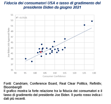 Tuttavia, le campagne precedenti ci insegnano che il tasso di gradimento è un buon indicatore per valutare le possibilità di vittoria del presidente uscente. A sua volta, il tasso di gradimento è fortemente correlato all'evoluzione della fiducia dei consumatori. Consigliamo agli investitori di continuare a seguire attentamente tale indicatore nei prossimi mesi.