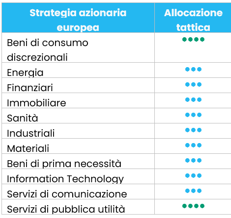 Al Livello 1, rimaniamo positivi (+1) sui beni di consumo discrezionali (beni di lusso, che rappresentano il 50% del settore, sostenuti da una stabilizzazione della crescita dei ricavi e da prospettive favorevoli per il 2026) e sui servizi di pubblica utilità (crescita attesa nei prossimi anni, trainata dall'elettrificazione e dalle connessioni alla rete; valutazione ragionevole).