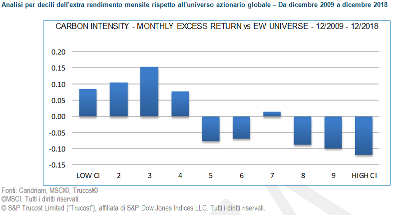 Per stimare l'impatto di un approccio di mitigazione dell'intensità di carbonio sui rendimenti degli investimenti, abbiamo analizzato la correlazione tra l'intensità di carbonio (IC) e i rendimenti finanziari su un periodo di nove anni, da dicembre 2009 a dicembre 2018, utilizzando l'analisi per decili. Abbiamo diviso l'universo azionario globale in dieci portafogli equiponderati all'inizio di ciascun mese, sulla base del fattore di intensità di carbonio, confrontando la loro performance con quella dell'universo equiponderato del mese successivo. Il portafoglio è stato ribilanciato su base mensile.