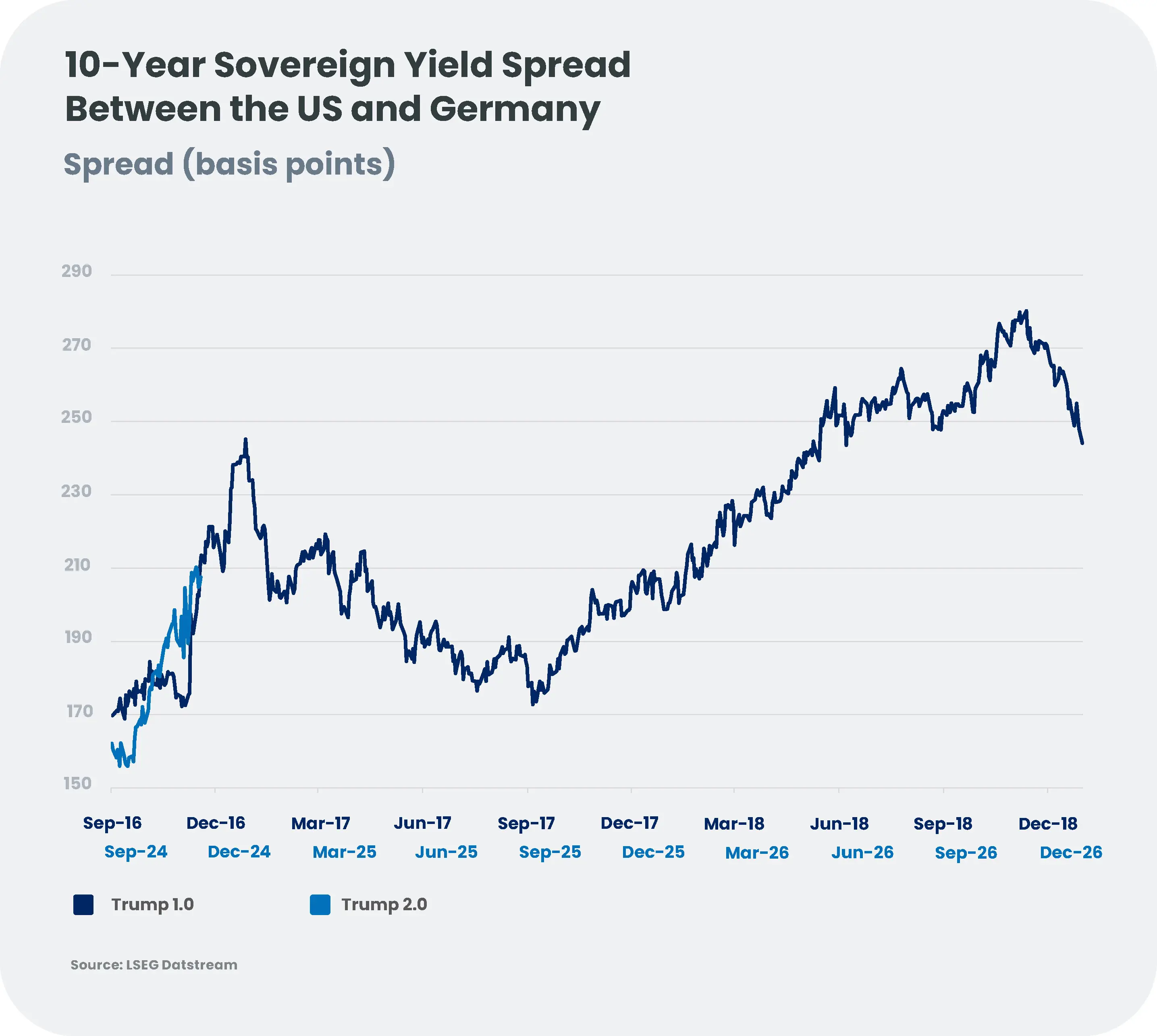 Su entrambe le sponde dell’Atlantico, i mercati hanno già rivisto in modo significativo le loro aspettative sulle politiche monetarie. I tassi della Federal Reserve attesi per la fine del 2025 sono stati quindi rivisti dal 2,8% di metà settembre, al 3,6% alla vigilia delle elezioni, per superare il 3,9% tre settimane dopo. Allo stesso tempo, le aspettative sui tassi europei per la fine del 2025 sono scese di quasi 30 punti base dopo le elezioni, tornando al livello di metà settembre pari al1,8%. La divergenza è evidenziata dai movimenti sulla parte lunga della curva dei rendimenti, dove lo spread dei tassi a 10 anni tra gli Stati Uniti e l’Eurozona è aumentato di 30 pb, nel periodo tra le elzioni statunitensi del 5 Novembre e il 22 Novembre, superando i 200 punti base.