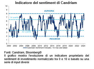 Come previsto, il mese di aprile ha registrato un consolidamento, dopo le significative performance registrate nei due trimestri precedenti. Di conseguenza, il nostro indicatore di sentiment composito, basato su un set completo di fattori di mercato, dati tecnici e sondaggi tra gli investitori, è sceso dopo aver lanciato segnali di allarme raggiungendo il livello di “euforia” a metà marzo.