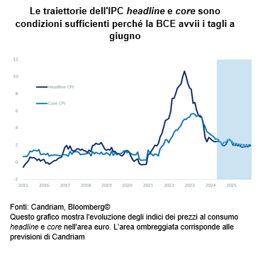 Osservando la situazione in dettaglio, l'Europa dovrebbe registrare una decelerazione dell'inflazione più rapida e sostenibile rispetto agli Stati Uniti. Salvo eventuali shock, le nostre previsioni indicano che l'inflazione complessiva nell'area euro potrebbe raggiungere il 2,0% verso la fine del terzo trimestre, per poi risalire leggermente e restare in seguito per la maggior parte del 2025 appena al di sotto dell'obiettivo del 2,0% della BCE. L'inflazione core nell’area dovrebbe convergere gradualmente verso il 2,0% entro il primo semestre del 2025. In sintesi, gli IPC headline e core, oggi al 2,5% a/a e in calo al di sotto del 2% nel 2025, rappresentano una condizione sufficiente perché la BCE inizi a ridurre i tassi a giugno.