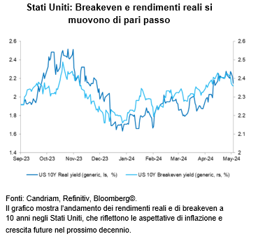 Queste sorprese al ribasso celano una buona notizia: le attese del mercato riguardo ai tagli dei tassi della Fed hanno probabilmente fatto il loro corso. Le aspettative di mercato nei confronti di una Fed più aggressiva, dall'inizio di quest'anno, si sono esaurite e questo corrisponde al picco dei rendimenti dei titoli del Tesoro USA a 10 anni, al 4,70% alla fine di aprile. È interessante notare che i rendimenti a lungo termine sono stati trainati di recente sia dal breakeven che dai rendimenti, che riflettono le aspettative di inflazione e crescita future.