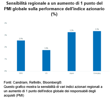Per quanto riguarda le azioni, aumentiamo ulteriormente la nostra view da un leggero sovrappeso a una posizione di sovrappeso. Nella nostra allocazione manteniamo un orientamento ciclico e quindi aggiungiamo azioni giapponesi ed europee, riducendo al contempo l'esposizione agli Stati Uniti: tra le principali regioni d'investimento, quest'ultima è quella che presenta la minore sensibilità a un aumento degli indicatori dell'attività globale, come il Global Purchasing Manager Index.