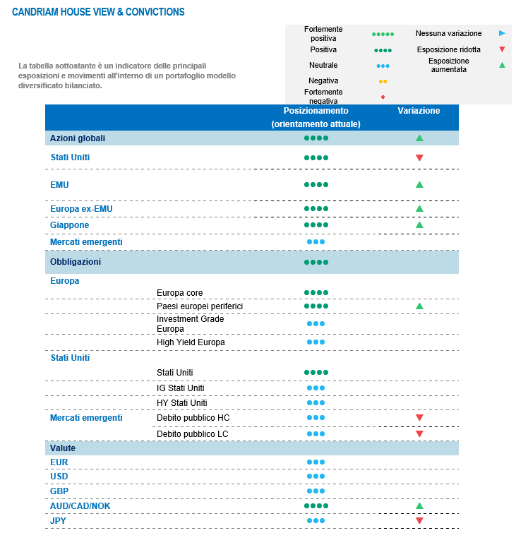 Continuiamo ad aggiungere una dose di beta e di ciclicità al portafoglio, per beneficiare di un’estensione dello scenario favorevole: inflazione più bassa del previsto, crescita più alta del previsto. In Europa, in particolare, le sorprese sul fronte economico sono ora positive e stanno determinando un miglioramento di sentiment e flussi. Pertanto, rivediamo ulteriormente al rialzo le azioni dell'area euro, da neutrali a leggermente positive, aggiungendo al portafoglio alcune small cap e banche.