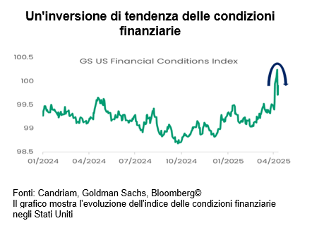 Rispetto allo scorso mese, le condizioni finanziarie sono notevolmente migliorate, dando il via alla ripresa del mercato. Stando ai recenti dati, gli spread creditizi si contraggono, le valutazioni azionarie sono aumentate e la liquidità sta tornando verso gli asset rischiosi, trainata dai flussi degli investitori retail e dalle maggiori esposizioni degli hedge fund. Questa inversione di tendenza introduce nuove dinamiche reflazionistiche, ma complica ulteriormente la capacità della Federal Reserve di intervenire in modo deciso. In particolare, le condizioni finanziarie sono meno restrittive mentre la dichiarazione del FOMC di maggio indicava rischi rialzisti per l'inflazione e la disoccupazione, inducendo a chiedersi se l'ottimismo del mercato sia prematuro o se sia solo un'anticipazione di punti di svolta macro. In sintesi, la cautela della Fed potrebbe essere giustificata, considerando i ritardi nelle decisioni e l'incertezza politica. I mercati sembrano inoltre indecisi su cosa aspettarsi e sono passati da tre a quattro e poi a due soli tagli dei tassi previsti nel 2025.