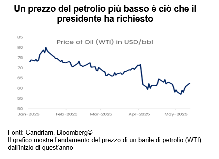 - Prezzi del petrolio in flessione. Il calo dei costi energetici funge da stimolo per le famiglie e le imprese, migliorando i redditi reali. Il Brent e il WTI sono entrambi diminuiti, in seguito all'aumento della produzione deciso dall'OPEC+ e a una minore domanda cinese. Tuttavia, i rischi geopolitici, soprattutto in Medio Oriente, restano un'incognita che potrebbe invertire rapidamente questa dinamica.