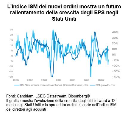 L'incertezza economica ha determinato revisioni al ribasso degli utili societari. Mentre i mercati azionari si sono ripresi dai minimi successivi al "giorno della liberazione", la crescita degli utili è in calo. Le attese sulla crescita degli EPS dipendono in larga misura dagli sviluppi della guerra commerciale e potrebbero quindi variare ulteriormente: al momento, in base alle nostre stime sull'espansione del PIL statunitense, prevediamo una crescita degli utili per azione (EPS) del +5% nel 2025 e del +2% nel 2026, molto inferiore alle proiezioni del consensus (+9,5% e 14,2%). Gli indicatori prospettici, come l'indice ISM dei nuovi ordini, segnalano una decelerazione degli EPS in futuro.