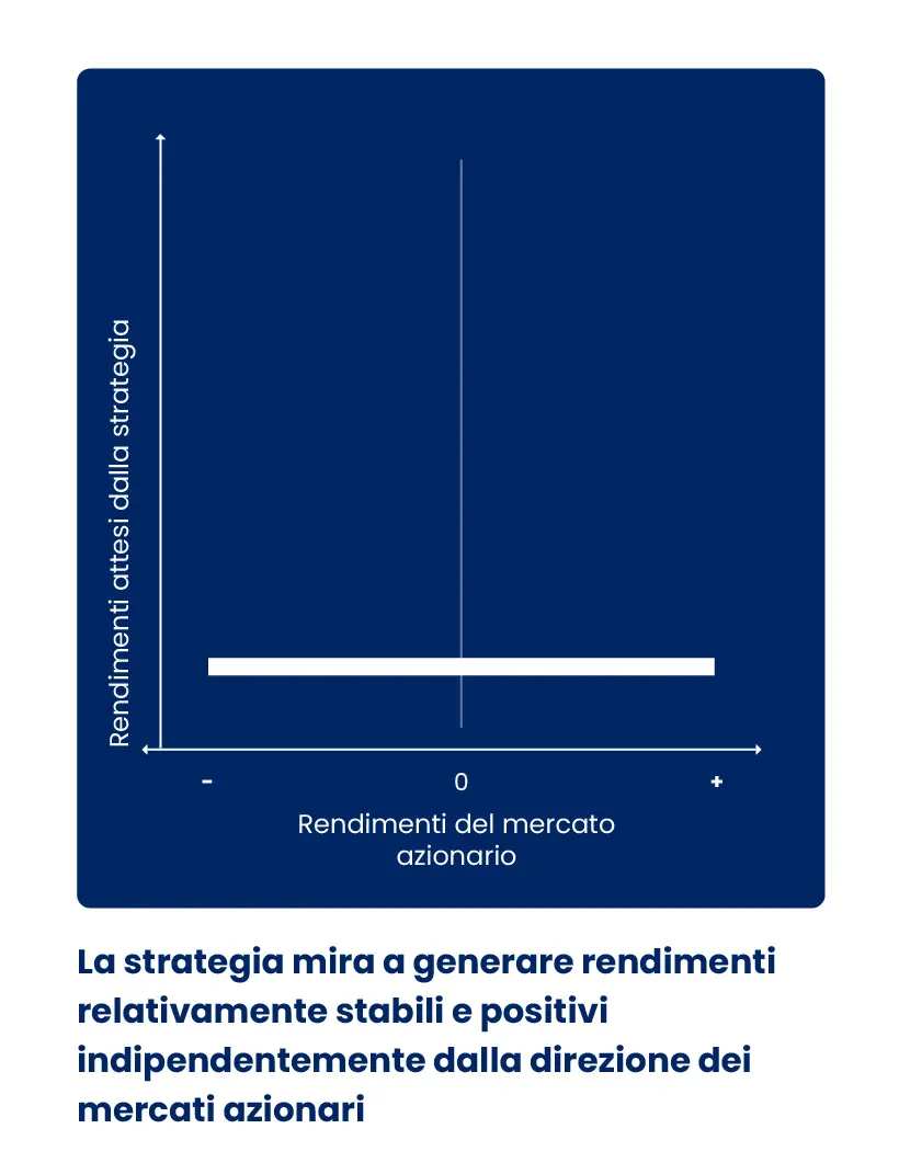 Le strategie market neutral prevedono l'assunzione di posizioni sia lunghe che corte sugli asset, con l'obiettivo di sfruttare il valore relativo o le inefficienze di prezzo. Mirano a una bassa esposizione netta al mercato azionario e a un livello di volatilità basso o moderato. Abbiamo individuato due distinte aree di mercato in cui ci impegniamo a estrarre valore offrendo al contempo rendimenti regolari:
