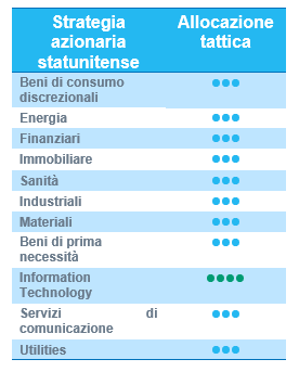 La nostra visione settoriale non ha subito modifiche. Siamo costruttivi sul settore tecnologico, ulteriormente favorito dallo sviluppo dell'intelligenza artificiale. Siamo cauti sulle valutazioni e monitoriamo possibili rotazioni.