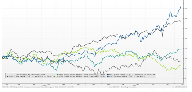 Taiwan (+11,8%) e Corea (+8,3%), paesi le cui economie sono orientate alle esportazioni, sono stati tra i primi della classe, dato il loro ruolo centrale nello sviluppo dell'IA. A giugno si è svolta la manifestazione high-tech Computex a Taiwan. Tra i presenti vi era Jensen Huang, CEO di Nvidia, che ha tenuto un discorso sulla roadmap dell'IA. L'evento ha sostenuto la performance di numerosi fornitori di IA con sede in entrambi i paesi. Il PMI manifatturiero della Corea del Sud è salito ulteriormente a 52, mentre le esportazioni nazionali sono aumentate per il nono mese consecutivo.