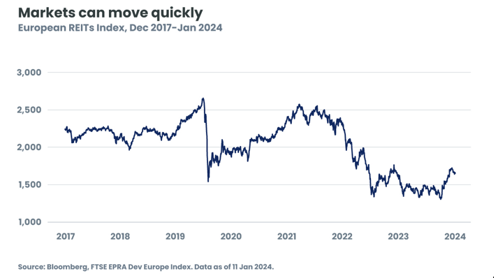 Given these dynamics, the recent shifts in the central bank narratives and interest rate expectations is very welcome. The shift to a ‘pause’ has loosened financial conditions and is likely to spur more commercial real estate (CRE) activity in both refinancing and transactions. In turn, we expect the changed rate environment will motivate many investors to step off the sidelines and begin to look at opportunities to commit incremental capital to the sector. This improvement has been most clearly visible in the public (REIT) markets, where there has been a rally in the final quarter of 2023, particularly in the stocks that were most aggressively leveraged going into 2021.