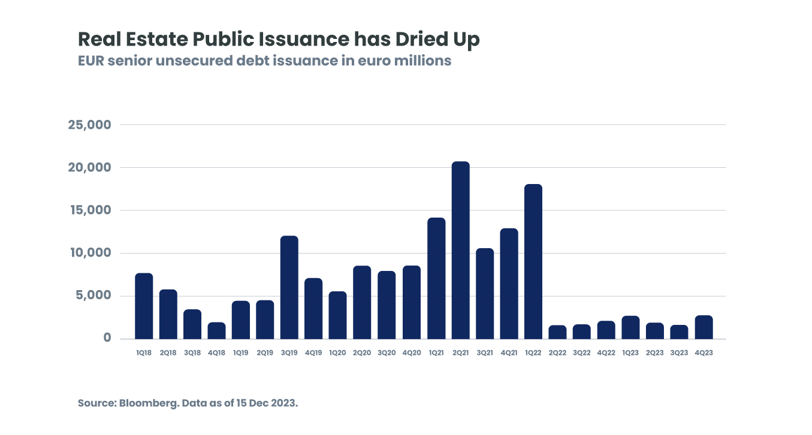 Real estate markets spent most of 2023 in statis, ‘frozen’ for the most part by rising interest rates and uncertainty related to asset valuations. Transaction flows were low by historical standards, similar to the levels seen during the Great Financial Crisis. Real estate credit markets have largely been closed to new issuers and other borrowers.