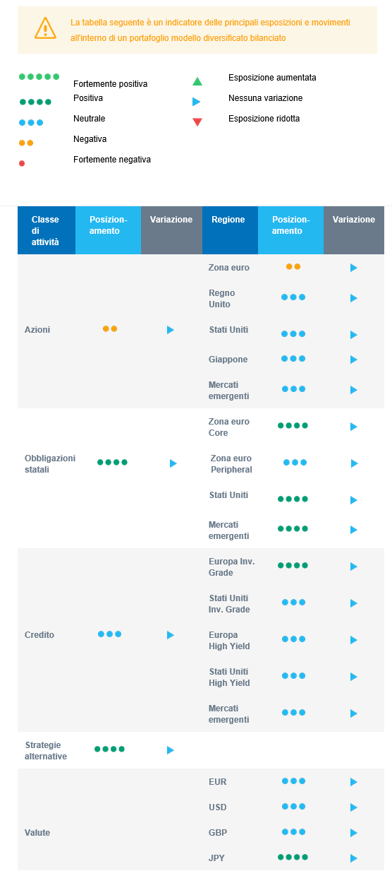 - Ci aspettiamo un rialzo limitato nel comparto azionario, ambito nel quale manteniamo attualmente un leggero sottopeso a fronte di una visione negativa rispetto alle azioni dell'eurozona e neutrale sulle altre regioni.