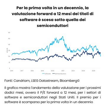 Al contrario, alcuni segmenti dell'universo di software e SaaS (Software-as-a-Service) sono alle prese con una dinamica differente. Gli agenti e gli strumenti di automazione basati sull'IA minacciano di ridurre i prezzi e di erodere i tradizionali modelli di abbonamento. Le ipotesi sulla crescita terminale sono oggetto di revisioni. Il problema non è il crollo della domanda, ma la sostituzione competitiva. La dispersione nel settore tecnologico è quindi aumentata in modo significativo: manteniamo una visione costruttiva su semiconduttori e hardware, ma siamo più cauti sui software.