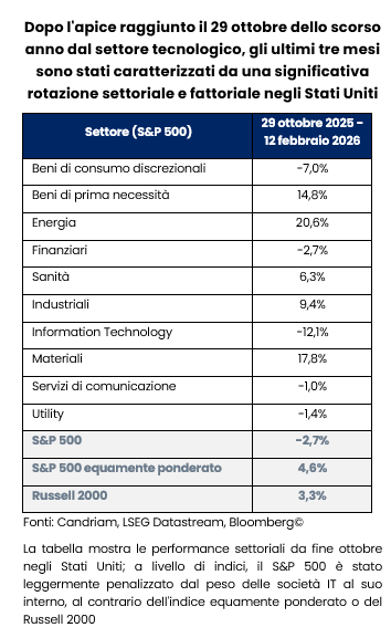 Questa polarizzazione spiega buona parte della recente rotazione. Gli indici equamente ponderati sovraperformano perché, in seguito alla correzione dei titoli a maggiore capitalizzazione, l'ampiezza del mercato è migliorata. I materiali e alcuni segmenti dell'energia beneficiano dell'impronta fisica dell'IA: produzione di energia, potenziamento delle reti, raffreddamento e necessità di metalli.