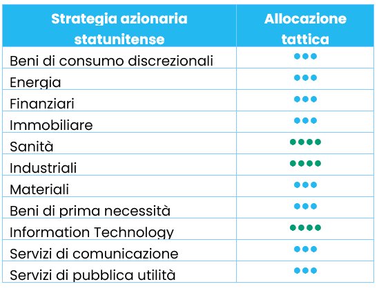Manteniamo la nostra attuale allocazione, con continui sovrappesi negli industriali, nella sanità e nell'information technology. Conserviamo una visione positiva sull'information technology, sostenuto da revisioni degli utili in miglioramento, una supply chain asiatica resiliente e utili futuri che dovrebbero confermare ulteriormente lo slancio fondamentale del settore. Al contempo, nelle prossime settimane monitoreremo attentamente i risultati e le reazioni del mercato, qualora si rendesse necessario passare a una posizione più neutrale.