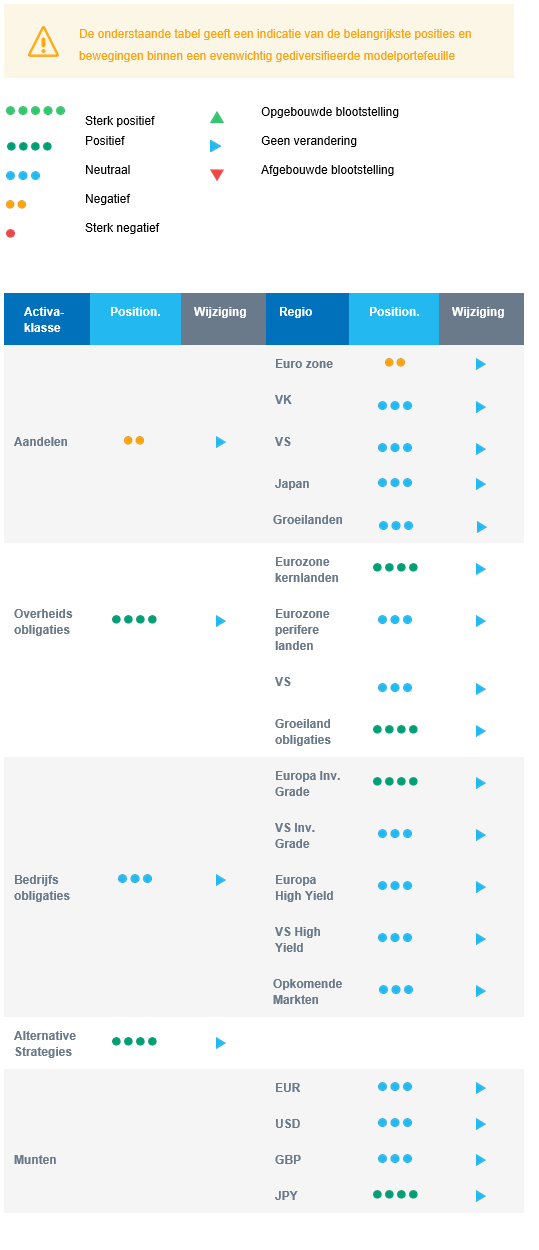 Onze strategie houdt rekening met de huidige achtergrond, die wordt gekenmerkt door economische veerkracht in de VS, het voorzichtige herstel in de EU en de voorzichtige benadering van het monetaire beleid in beide regio's. Deze achtergrond vereist een geduldige beleggingsaanpak. Over het algemeen handhaven we een neutrale allocatie voor aandelenindices buiten Europa, waarbij de laatstgenoemde regio het dieptepunt lijkt te hebben bereikt, maar nog steeds relatief minder aantrekkelijk is dan de rest van de wereld. Wat sectoren betreft, zijn we positief over de sectoren Technologie, Gezondheidszorg en Basisconsumptiegoederen. Binnen het vastrentende segment blijven we profiteren van carry via Investment Grade bedrijfsobligaties en groeilandenobligaties, terwijl we een lange duration voor Europese obligaties aanhouden.