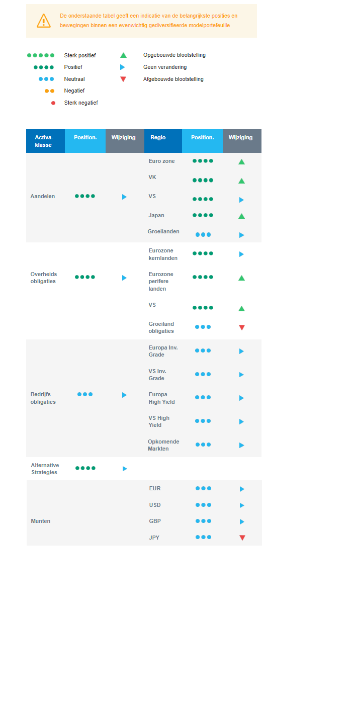 Onze vooruitzichten voor aandelen blijven positief. We verhogen onze visie verder van een lichte overweging naar een overwogen positie, met een voorkeur voor ontwikkelde markten (VS, Europa, en Japan) tegenover opkomende markten. Met de toevoeging van cycliciteit aan de portefeuille profiteert de strategie van het uitbodemen van de PMI's en renteverlagingen door centrale banken. Dit laatste zou als een bovengrens moeten werken voor de obligatierente op lange termijn, wat onze positieve visie op staatsobligaties van de eurozone, de perifere eurozone, en de VS ondersteunt. We zijn neutraal wat betreft investment grade en high yield bedrijfsobligaties, ongeacht de regio, omdat we de voorkeur geven aan carry boven spreads.