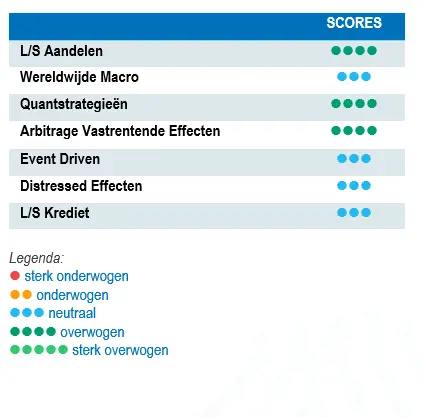 Macro-strategieën behaalden in oktober gemiddeld een bescheiden maar weliswaar positief rendement. De belangrijkste aanjagers van het resultaat waren shortposities in aandelen, longposities in de Amerikaanse dollar en longposities in een selectief aantal grondstoffen. Op dit moment zijn Global Macro strategieën eerder gediversifieerd met diverse kleine posities in aandelen, rente, valuta's en grondstoffen dan dat ze hun portefeuille concentreren in slechts een paar high conviction posities. De rendementen van macrostrategieën sinds het begin van het jaar waren relatief laag en lagen onder de verwachtingen. Er wordt echter verwacht dat de huidige en verwachte omgeving interessante investeringsmogelijkheden zal bieden.