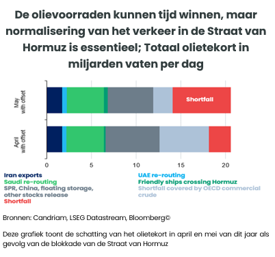 Ons basisscenario blijft daarom voorzichtiger dan aan het begin van het jaar. De kans op een kortstondige oliepiek is afgenomen, terwijl een verstoring over meerdere maanden waarschijnlijker is geworden. In zo'n scenario blijven de olieprijzen enkele maanden hoog, vertraagt de groei en stijgt de inflatie voordat het opnieuw kan stabiliseren.