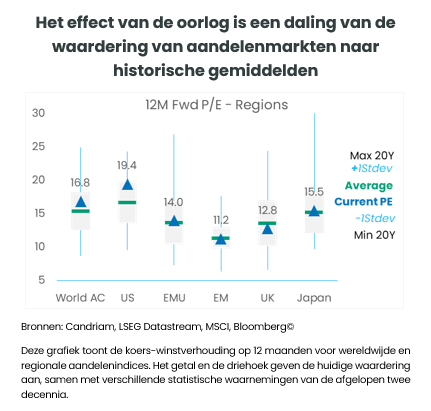 Wat aandelen betreft, zijn we nu breed neutraal over het geografische spectrum. De oorlog in Iran heeft de afgelopen weken geleid tot een daling van de aandelenwaarderingen. Dit is voor ons nog geen voldoende instapsignaal: we blijven bereid om opnieuw in risicovolle activa te stappen als de Straat van Hormuz weer opengaat, de olie stabiliseert in de richting van USD80-85/vat en de rentedruk afneemt. De Verenigde Staten blijven relatief geïsoleerd dankzij de binnenlandse energieproductie en een veerkrachtige vraag. Bovendien leggen aantrekkelijke waarderingen van technologie een bodem onder de aandelenmarkt. Deze relatief betere positie wordt weerspiegeld in een iets duurderewaardering vergeleken met andere regio's. We handhaven een neutrale houding ten opzichte van Europa, Japan en groeilanden, omdat ze gevoeliger zijn voor energieprijzen en de dynamiek van de wereldhandel.