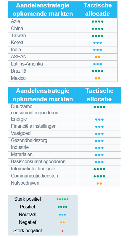 Wat regio's betreft, hebben we Brazilië opgewaardeerd van neutraal naar overwogen vanwege de positieve macro-economische situatie en de afnemende geopolitieke spanningen. We hebben Korea vanuit tactisch oogpunt afgewaardeerd. De markt is erg verhit, maar de fundamentals van het bedrijf blijven aantrekkelijk.