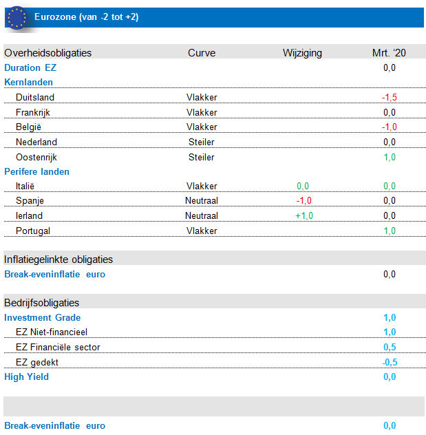 In de afgelopen maanden werden de perifere landen van Europa opnieuw ondersteund door de kwantitatieve versoepeling van de ECB – ondersteuning die nog fors uitgebreid werd in de loop van maart. Aanvankelijk kondigde de ECB immers een uitbreiding van het activa-aankoopprogramma met 120 miljard euro aan op de bijeenkomst van maart. Een week later kwam de ECB met het PEPP (Pandemic Emergency Purchase Programme) op de proppen, waarmee er 750 miljard euro meer overheids- en bedrijfsobligaties aangekocht zullen worden, met voortaan ook Griekse overheidsobligaties. Ondanks een mogelijke toename van het aantal emissies zorgt dit aankoopprogramma ervoor dat het nettoaanbod normaal negatief zal zijn, wat op korte termijn een steunfactor vormt voor de rentevoeten. Bij de obligaties van de perifere landen blijven we selectief de voorkeur geven aan Portugal, terwijl we onze blootstelling aan Ierland verhoogd hebben. We blijven van mening dat de overheidsobligaties in euro relatief duur zijn en houden vast aan onze neutrale durationpositie. Dit doen we door een negatieve duration aan te houden op onze Duitse obligaties, ten gunste van Oostenrijk en Luxemburg bij de kernlanden.