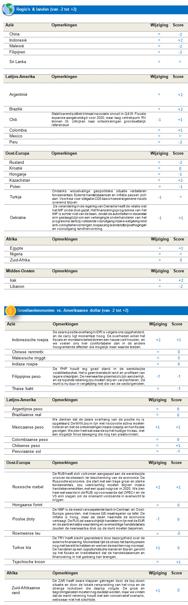 In ons basisscenario op middellange termijn zullen de olieprijzen stabiliseren rond de 30-40 dollar, daalt de wereldgroei naar -1,5% in 2020 omdat de meeste ontwikkelde en groeilanden in H1 2020 in een technische recessie vallen, maar vindt er in H2 2020 een U-vormig herstel plaats, nemen de HY-vs.-IG spreads van groeilandenobligaties af (aangezien bepaalde scherpe bewegingen van de olie-exporteurs en kwetsbare HY kredieten van begin maart worden teruggedraaid), en dat geldt ook voor de EM spread van de index (richting 350bp tegen het einde van het jaar). In ons basisscenario zullen Angola en Ecuador volgens ons geen 'harde defaults' ondergaan, aangezien de terugbetalingsschema's vrij krap zijn, zowat 1,5 tot 2 miljard dollar elk in 2020. De financieringstekorten kunnen gedicht worden via nog onaangekondigde verdere fiscale verkrapping.