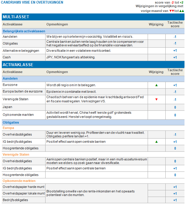 Het risico van een tweede golf blijft sterk aanwezig en zal boven het pad naar de normalisatie blijven hangen op de financiële markten. Bijgevolg blijven we onderwogen in aandelen en passen we nieuwe beschermende derivatenstrategieën toe.