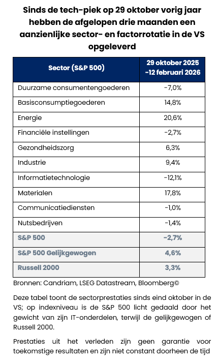 De belangrijkste Amerikaanse aandelenindices maken pas op de plaats. Sinds de piek van eind oktober in de Technologie heeft de S&P 500 zijwaarts bewogen. Maar onderliggend zien we een heuse rotatie. Energie is meer dan 20% gestegen, Materialen bijna 20% en Basisconsumptiegoederen meer dan 10%. Technologie daarentegen is in dezelfde periode met ongeveer 11% gedaald. De gelijkgewogen index is geruisloos gestegen en sloot op nieuwe hoogtepunten. Meer sectoren stijgen dan dalen. De krantenkoppen spreken over stagnatie; onderhuids nemen de spanningen toe en wordt kapitaal herverdeeld.