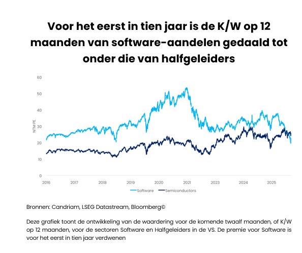 Delen van het software- en Software-as-a-Service (SaaS) universum hebben daarentegen te maken met een andere dynamiek. AI-gebaseerde agents en automatiseringstools dreigen de prijzen te drukken en traditionele abonnementsmodellen uit te hollen. De assumpties voor hun toekomstig groeipotentieel worden herzien. De dispersie binnen Technologie is daarom aanzienlijk toegenomen - we blijven positief over Halfgeleiders en Hardware, maar zijn voorzichtiger over Software.