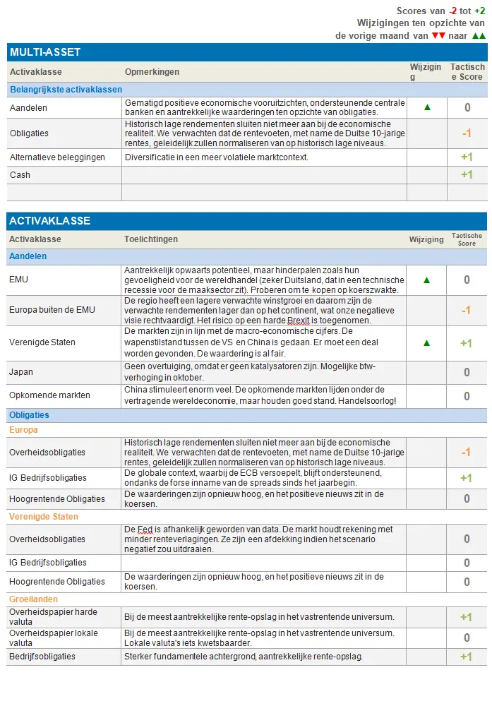 In juli consolideerden de markten hun sterke prestaties van H1 2019. Amerikaanse aandelen, die een boost kregen door degelijke winstrapporten en een verwachte renteverlaging door de Fed, namen het voortouw. Aangezien de markt reeds rekening hield met een renteverlaging van de Fed en aangezien een opflakkering van de handelsspanningen niet kon worden uitgesloten, beslisten wij in juli al om onze aandelenposities af te bouwen. Reeds begin augustus begonnen de markten te dalen omdat de Fed blijkbaar niet versoepelend genoeg was. De Fed verlaagde immers de rente met 25bp en zei dat dit niet het begin was van een nieuwe cyclus verlagingen. Donald Trump kondigde ook nieuwe invoerheffingen aan op Chinese goederen. Zolang een recessie zich niet aandient, zullen beleggers echter in risicovolle activa blijven beleggen. Dat volstaat voor ons om te blijven kopen op koerszwakte.