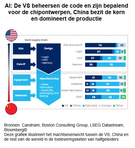 De Verenigde Staten behouden een duidelijke voorsprong in de fundamentele lagen van AI: halfgeleiders, cloudinfrastructuur, grote taalmodellen en software-ecosystemen. Hun innovatiekracht blijft ongeëvenaard, gevoed door diepe kapitaalmarkten, geconcentreerde talentclusters en een commerciële dynamiek die adoptie versnelt. Toch evolueert ook het Amerikaanse leiderschap: het enthousiasme van de markt steunt minder op aankondigingen en meer op de duurzaamheid van de kapitaaluitgavencyclus die AI-expansie ondersteunt. Vragen rond hyperscaler-investeringen, toeleveringsketens voor chips en rendabiliteit zijn te verwachten – en volgens ons gezond. Ze wijzen op een rijpend thema, niet op een uitdovend.