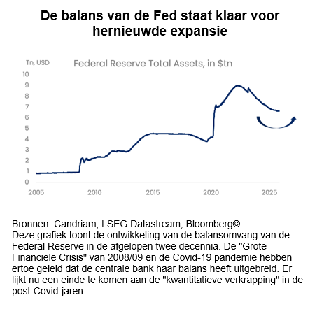 De omslag van kwantitatieve verkrapping naar een hernieuwde balansuitbreiding kwam snel en krachtig tijdens de FOMC-vergadering in december: de Fed start met de aankoop van USD 40 mrd per maand aan T-bills, met bijkomende inhaalaankopen van USD 20–25 mrd indien nodig. Het programma ging van start op 12 december en herstelt een liquiditeitsritme dat in jaren niet meer is gezien.