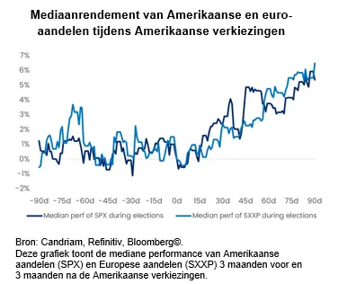 Deze gebeurtenissen zijn mogelijk belangrijk voor beleggers, omdat de volatiliteit historisch toeneemt in de weken voor de Amerikaanse verkiezingen, zoals blijkt uit de beperkte mediane prestaties van zowel Amerikaanse als euro-aandelen in de aanloop naar de Amerikaanse verkiezingen.