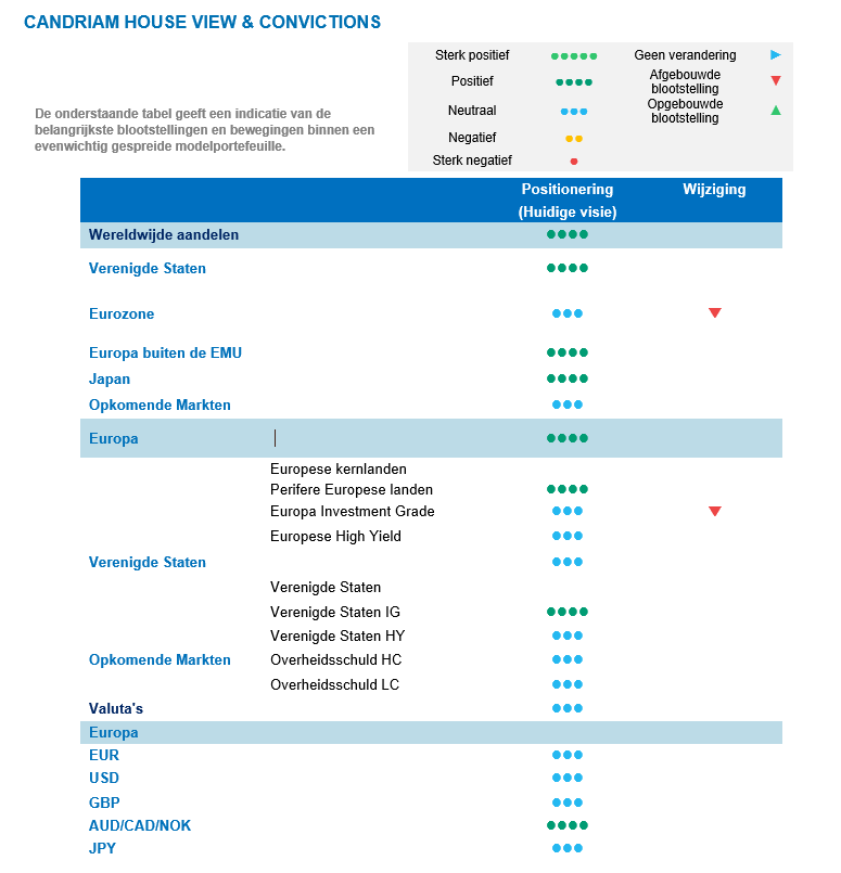Aandelen: We verlagen onze positie in aandelen licht van overwogen naar licht overwogen. De recente stijging van de politieke onzekerheid sloeg over op de financiële markten en Franse activa, wat leidde tot een iets hogere volatiliteit in de regio.
