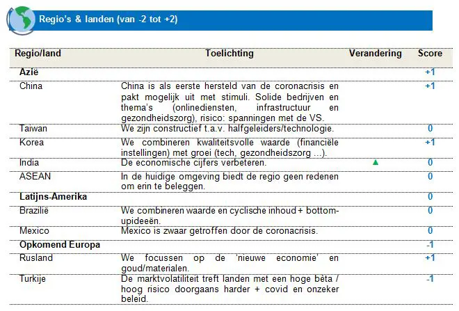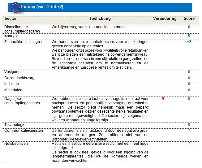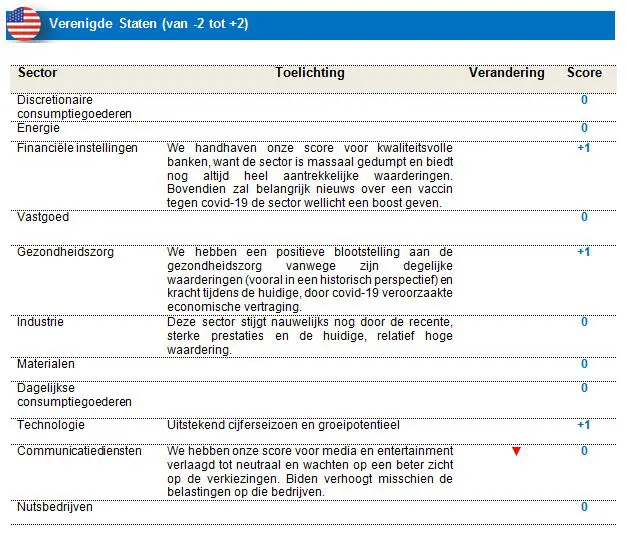 We hebben onze score voor media en entertainment verlaagd tot neutraal en wachten op een beter zicht op de verkiezingen. Biden verhoogt misschien de belastingen op die bedrijven. We handhaven onze positieve blootstelling aan banken. Wij geloven dat een vaccin een stijlrotatie in gang zal zetten, en de economie zal toelaten om te normaliseren en de Amerikaanse rentes om te stijgen. We behouden onze overweging van technologie ondanks de recente daling, want de technische analyse blijft positief met solide fundamentals en langdurige groeiaanjagers. We handhaven onze neutrale score voor de industrie want die sector stijgt nauwelijks nog door de recente, sterke prestaties en de huidige, relatief hoge waardering.